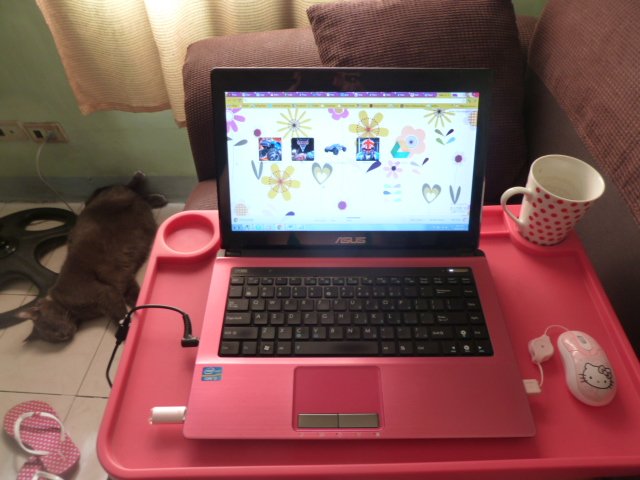 Here’s what my makeshift work station looks like. Comes complete with a cat. Yeah, I know, it’s an explosion of frilly colors in the house. I used to hate pink when I was still in still stuck in my mukhang lesbiana/woodchuck phase favoring darker colors like black, red and even green because I refused to look like a girl. But these days, I’ve mellowed down considerably, accepted the fact that I can no longer wear angsty shoutout shirts and I ended up collecting pink things, like a proper female should. The cute Hello Kitty mouse is a gift from the boyfriend.
