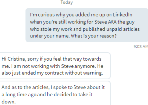 Let me also stress that Steve Hammond took down the posts 2 months after I found out that my articles were published. That means, the moment I lost contact with the guy, I didn’t know my work was posted for two whole months. The damage was already done. Kudos to my coworker for having the decency to get the author name dropped.
