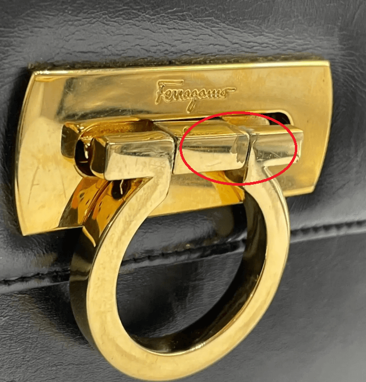 There is a surface area on the Gancini buckle, the bag’s main hardware, where the shallow metal part has chipped. This is a permanent damage and cannot be fixed with electroplating.